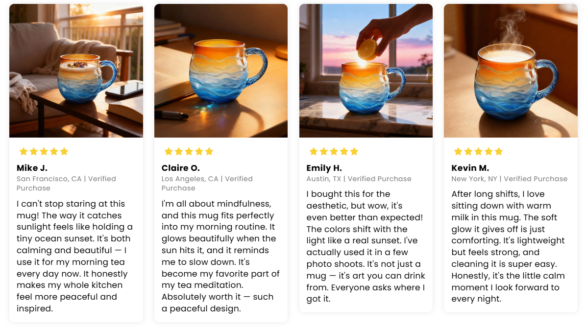 The Sunset Tide Mug is a unique work of art, handcrafted from high-quality borosilicate glass. Its surface ripples mimic gentle sea currents, while the gradient tones flow together like a setting sun meeting the waves. Each piece captures the tranquil rhythm of the ocean — a soothing reminder of nature's timeless beauty in every sip.